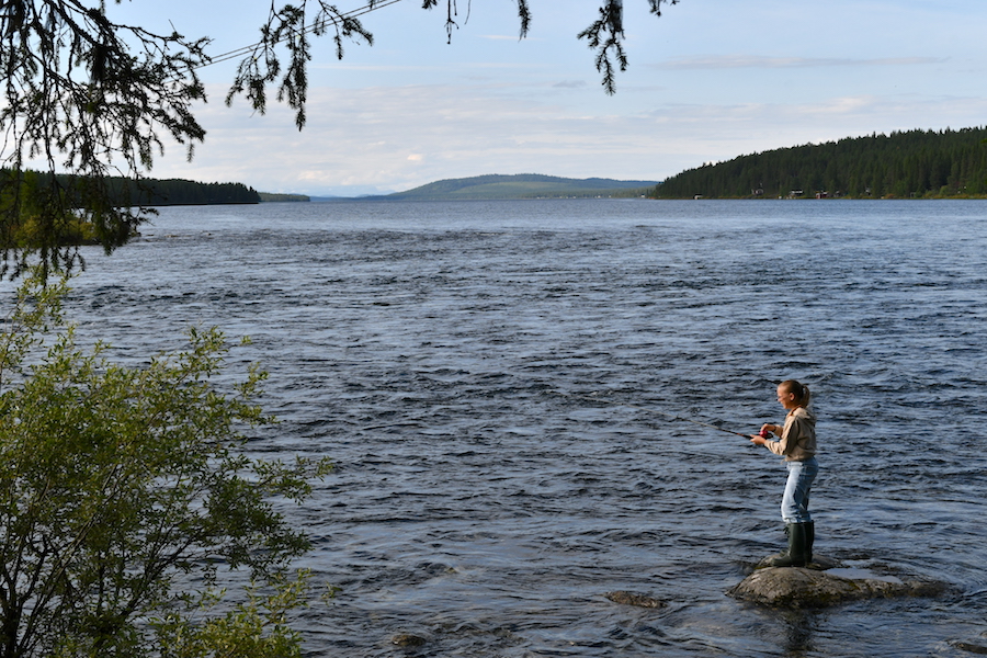 川で釣りする少女。まるで湖のような広大な川です。