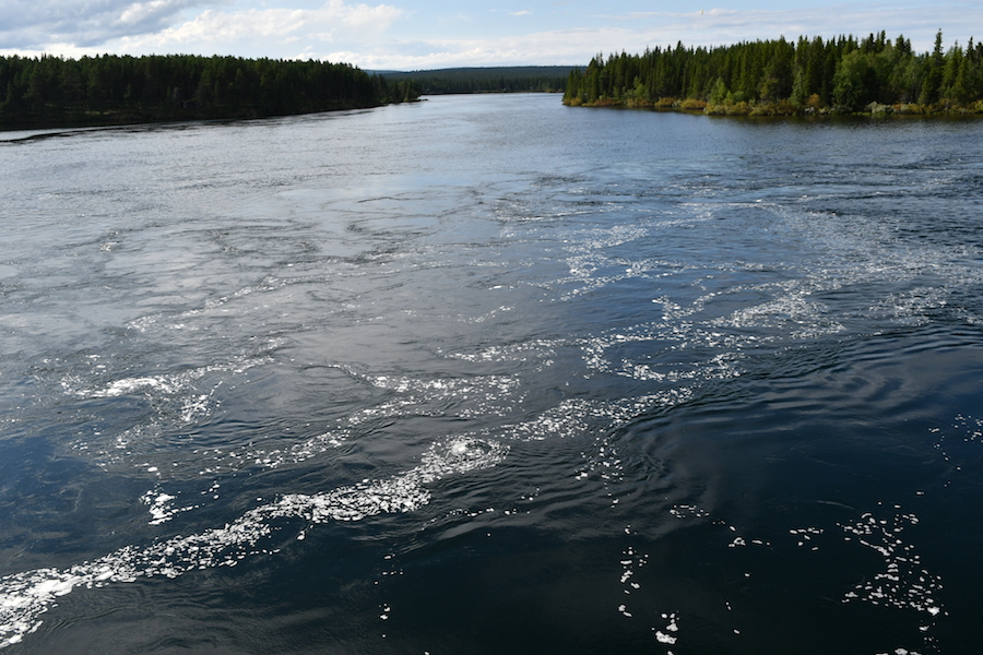 川の水面が泡立つくらい速い流れ。その水量に目眩がします。