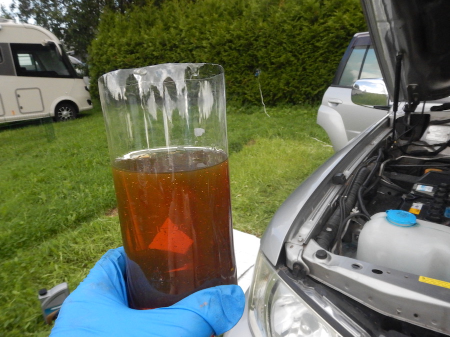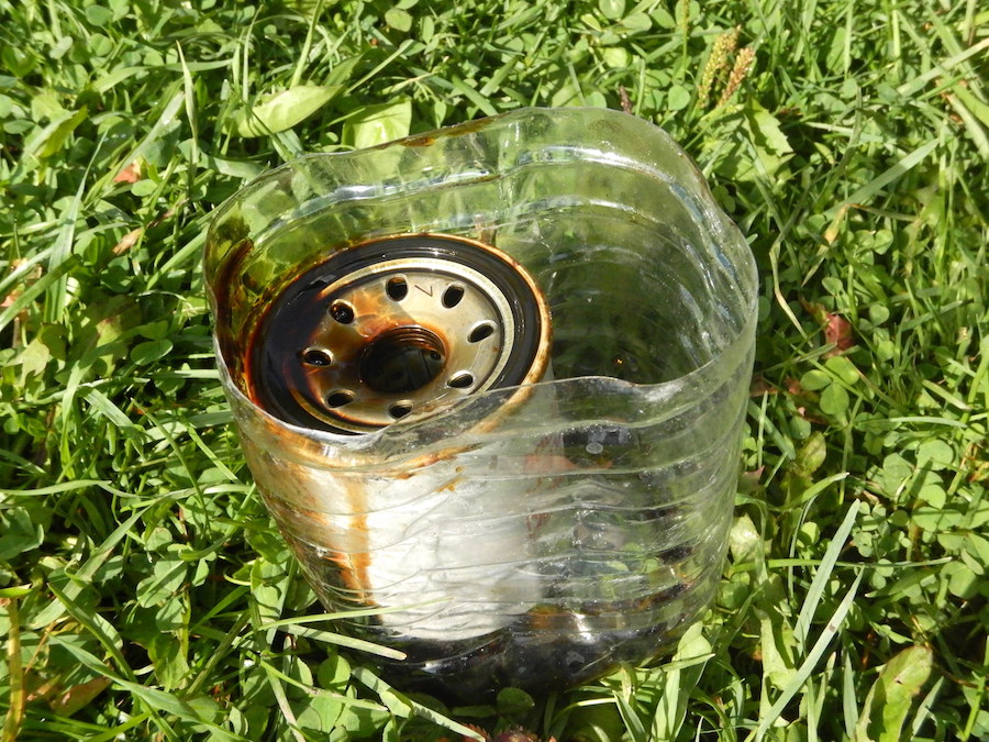 オイルの入れ方はこれも日本から持ってきた500mlペットの頭を切ったヤツにオイルを入れて注ぎます。これでオイルをこぼす事無く注げました。