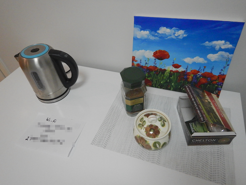 テーブルの上に湯沸かしポットやコーヒー、紅茶が置いてあります。