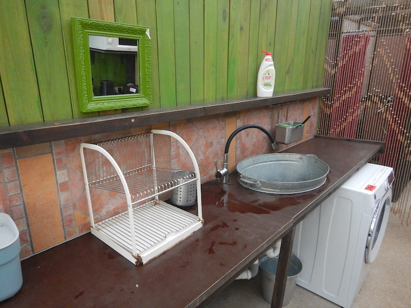 シンクは一つ。バケツを使ったアイディアは素敵だけど、ちょっと使いにくいです。