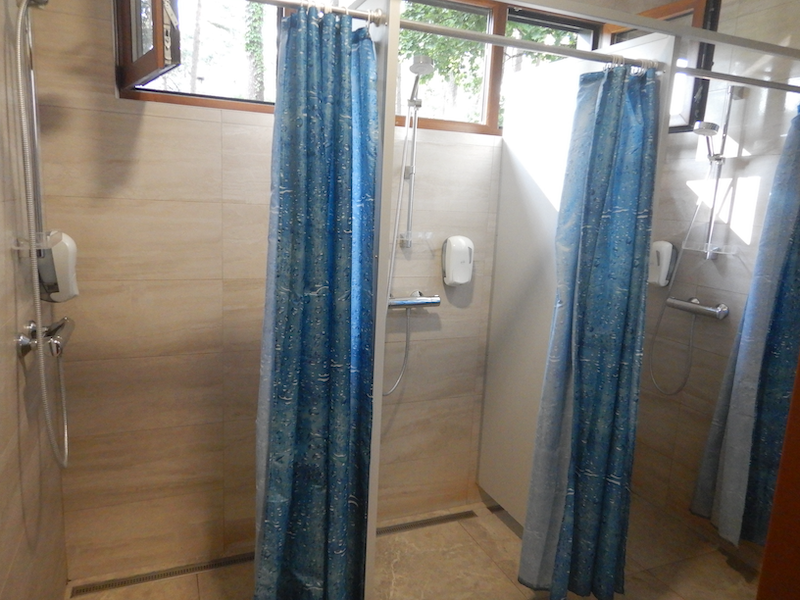 奥にシャワーが3つあり、シャワージェルも完備です。これはスゴい!!