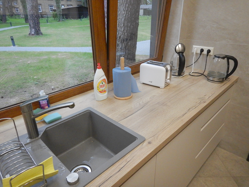 窓に向かってシンクが1つ。トースターや湯沸かしポットもあります。