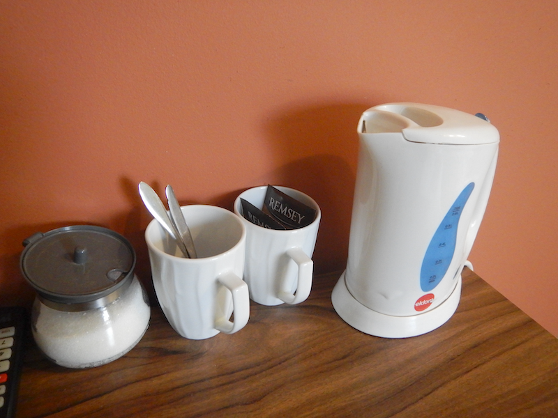 棚の上には湯沸かしポット、カップ、ティーバッグも置いてあります。