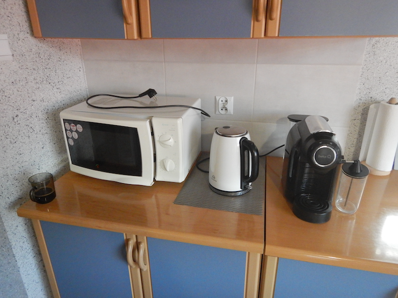 電子レンジ、湯沸かしポット、コーヒーメーカー。