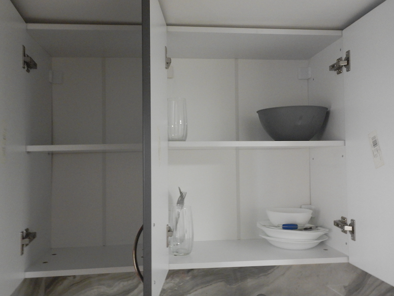 上の棚に入ってる食器はこれだけ。湯沸かしポットもないのでお湯は沸かせません。カップもないから電子レンジでお湯を作るのも無理ですね。