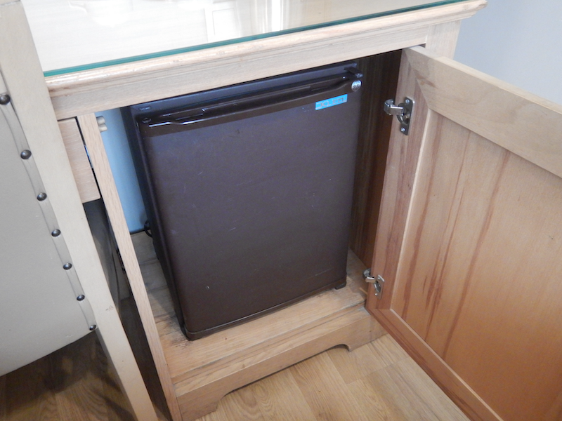 机の下の開き戸内に冷蔵庫。