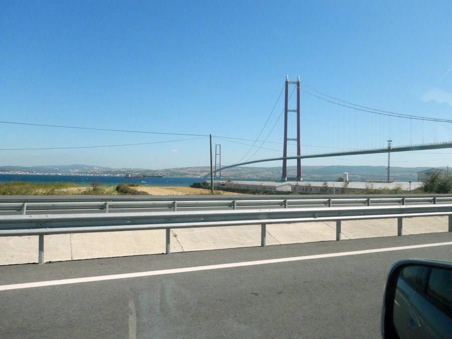 トルコのヨーロッパ側とアジア側を結ぶ吊り橋が見えてきました。