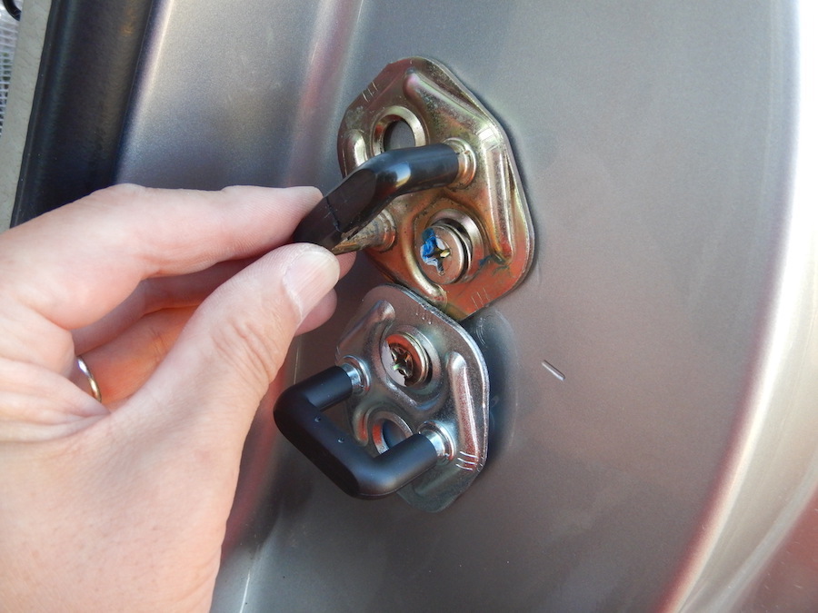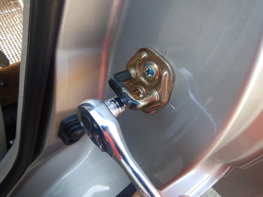 二本とも付いたら、ネジをゆるく締めて、ドアを静かに一度閉めて開ける。これでストライカーとドアのラッチの位置合わせが出来た、、、と思う・笑。