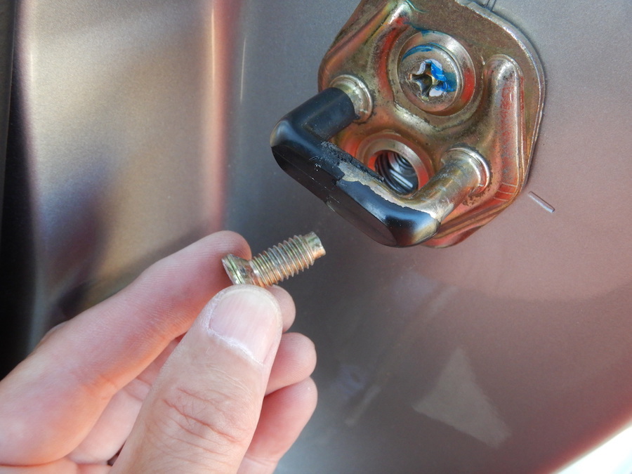 ボディ鉄板内側に溶接してあるナットが、万が一にも脱落したら、その時点でドアが閉まらなくなり走行不能になるので、念には念を入れてすぐに新ストライカー付ける。