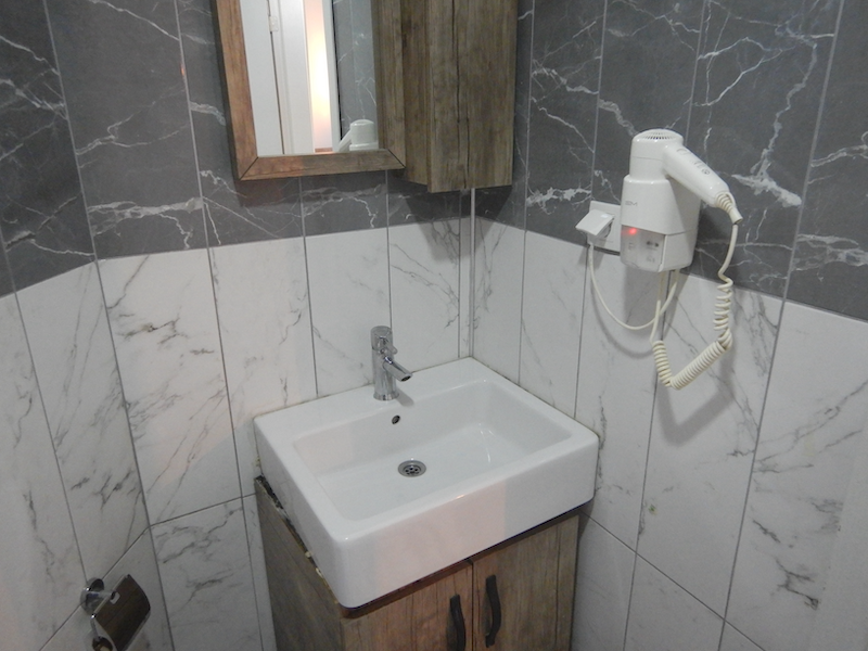 シンプルだけどまあまあ広い部屋です。お茶セットがないのは残念だけど、Wifiは問題なく使えます。エアコンはよく効いて温度調節も可能です。
