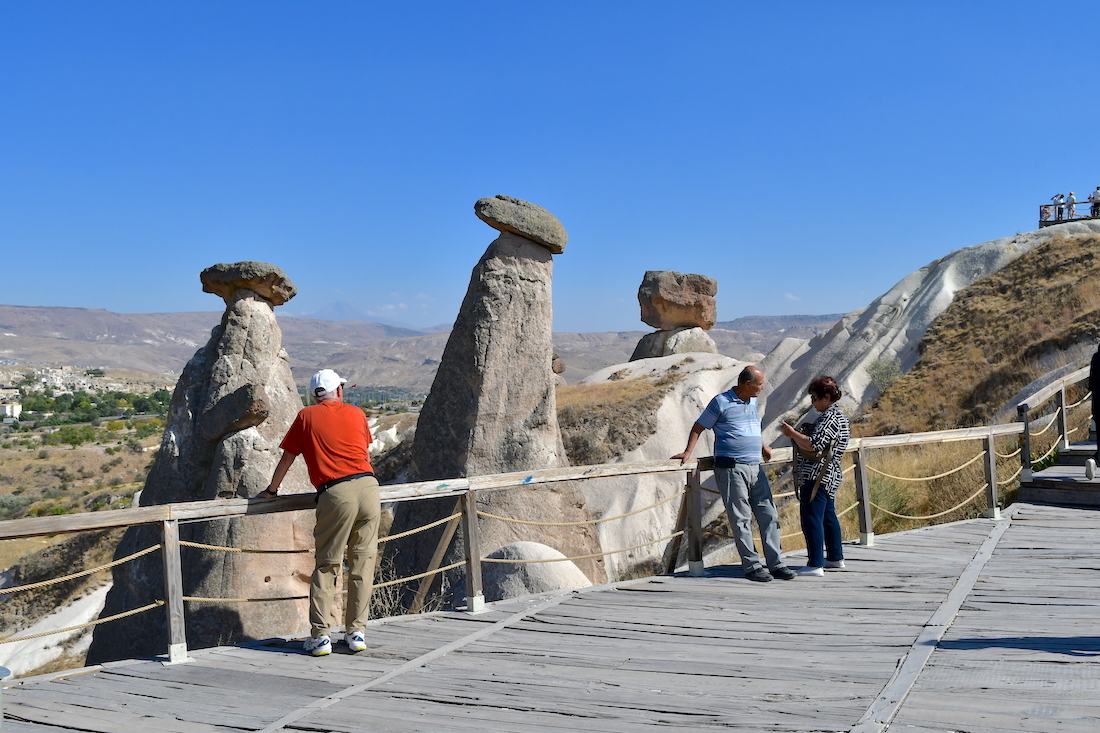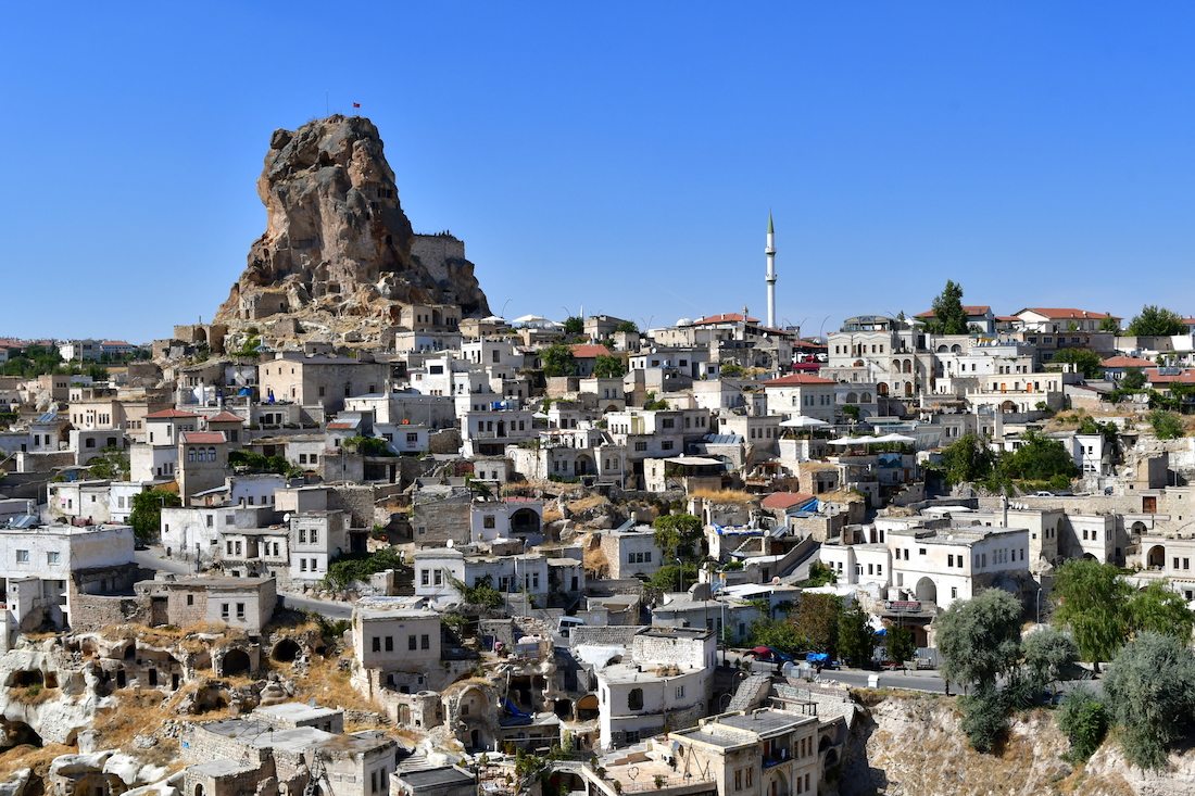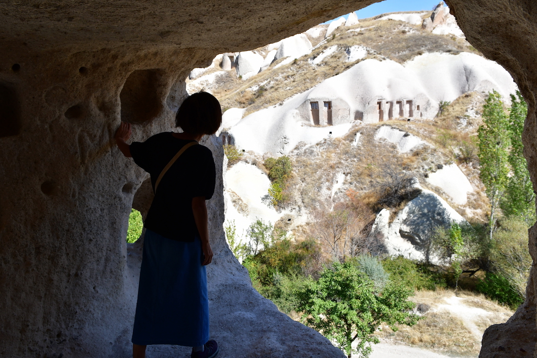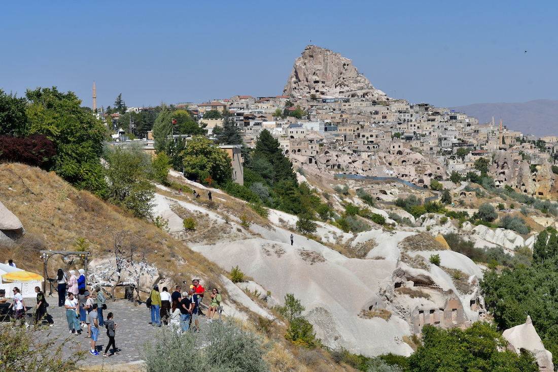 ここはその昔、ここに隠れ住んでいたキリスト教徒が、ブドウの肥料にするために鳩の糞を集めた場所だそうです。確かに素晴らしい眺め。ひときわ高いのはウチヒサル城。