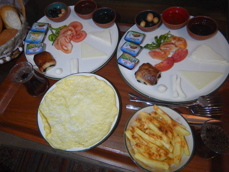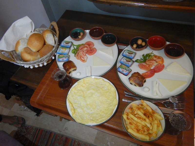 しばらく待ってるとノックが聞こえ、レセプションの男性がトレーに載せた朝食を運んできてくれました。一緒にチャイの入ったポットを置いていってくれます。