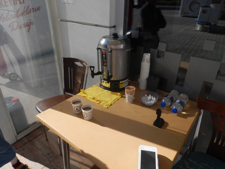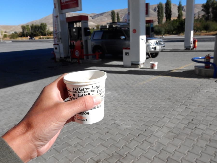 ガソスタのにいちゃんが、「コーヒー飲むか?」と携帯翻訳で言うので付いていくと、店の前にインスタントコーヒーとチャイのマシンがありました。