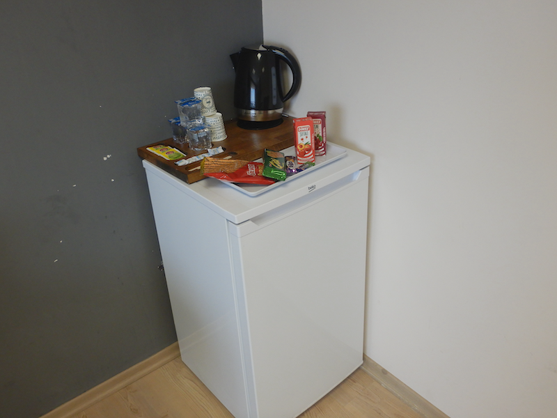 冷蔵庫の上にはお茶セットの他にスナック菓子も♪ ジュースまで置いてあります。