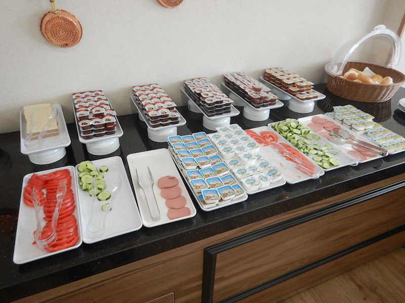 お次は定番のトマト、きゅうり、ピンクのハム。最初は色々なものが置いてあるな〜♪と思ったけれど、よく見ると同じものが2列並んでるだけd( ̄  ̄) ジャムは山積みです。