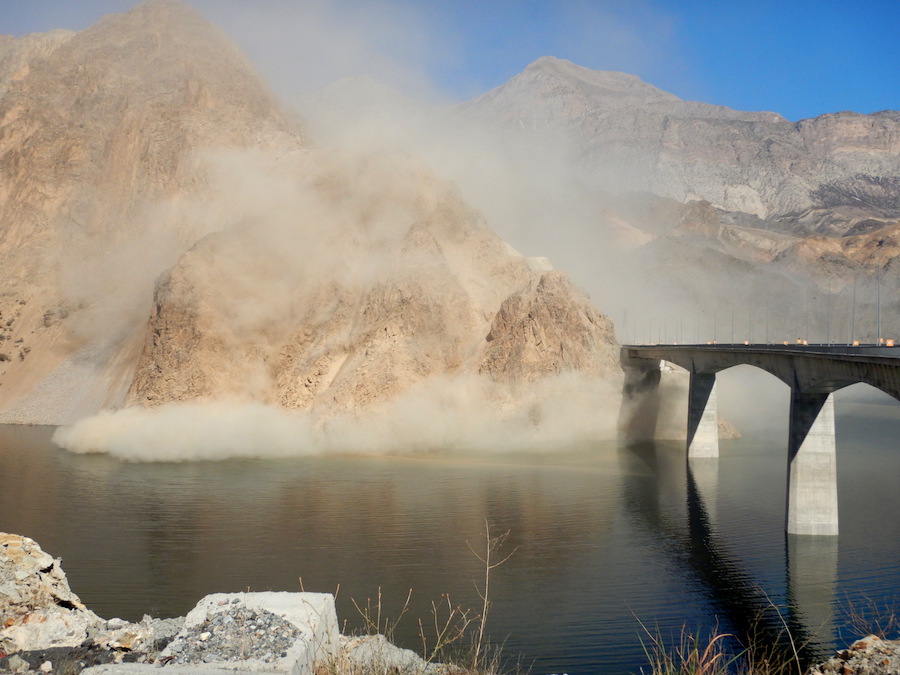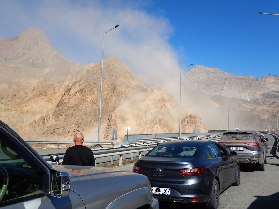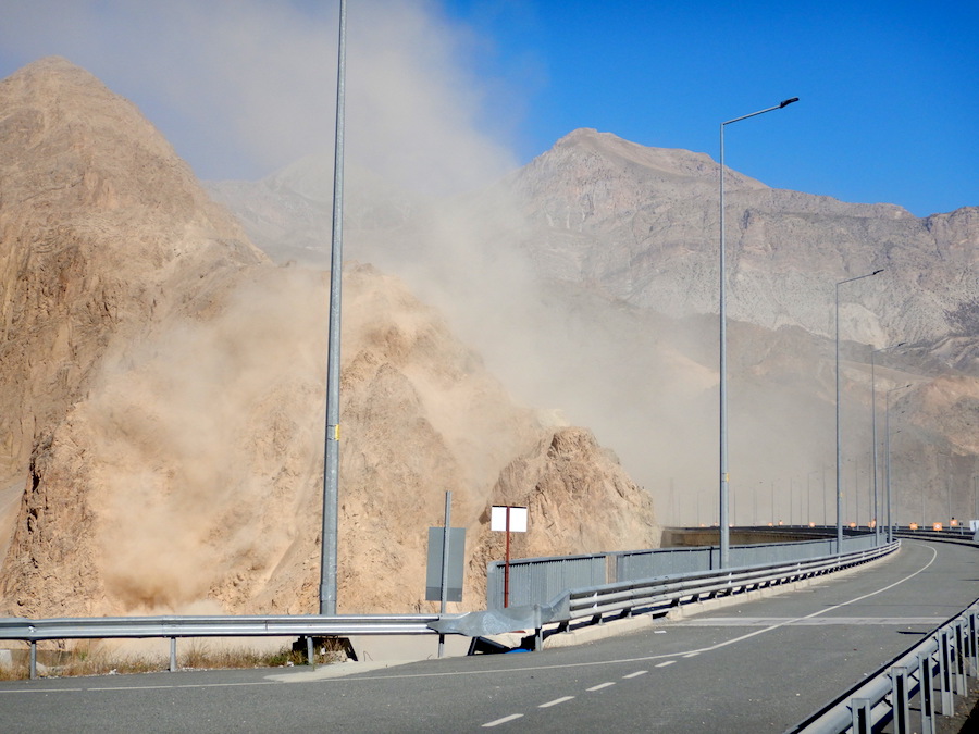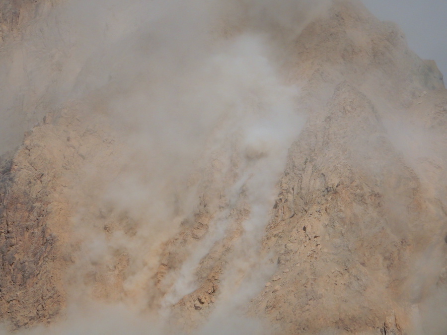 そう言えば前方の山全体が土煙で覆われています。音はしないのに、上から岩がひっきりなしに転げ落ちてきています。