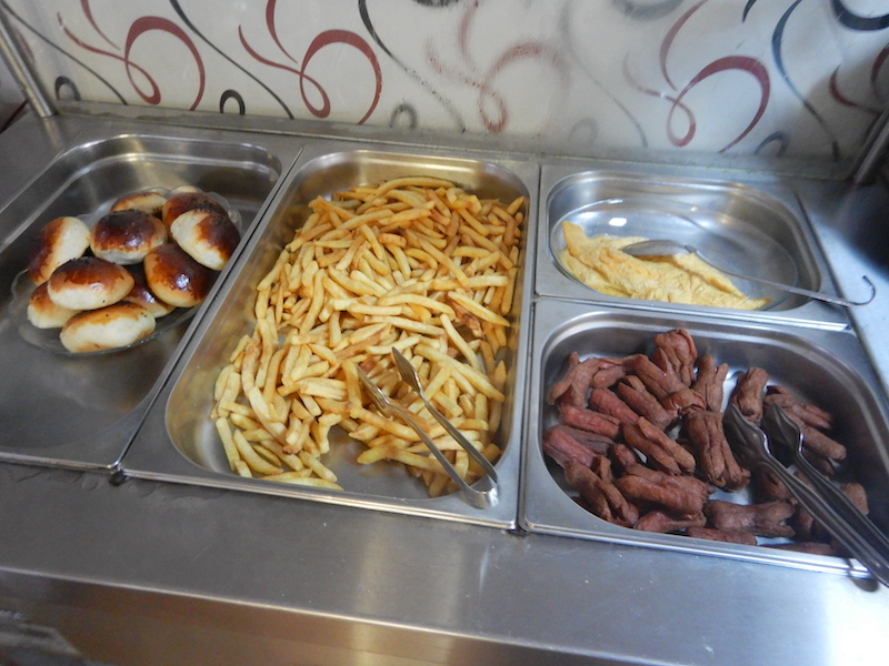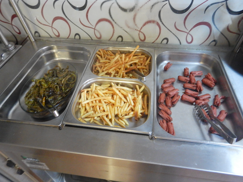 ポテトフライはトングが触れないくらい熱々。シシトウの油炒めもあります。