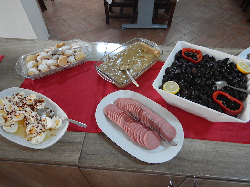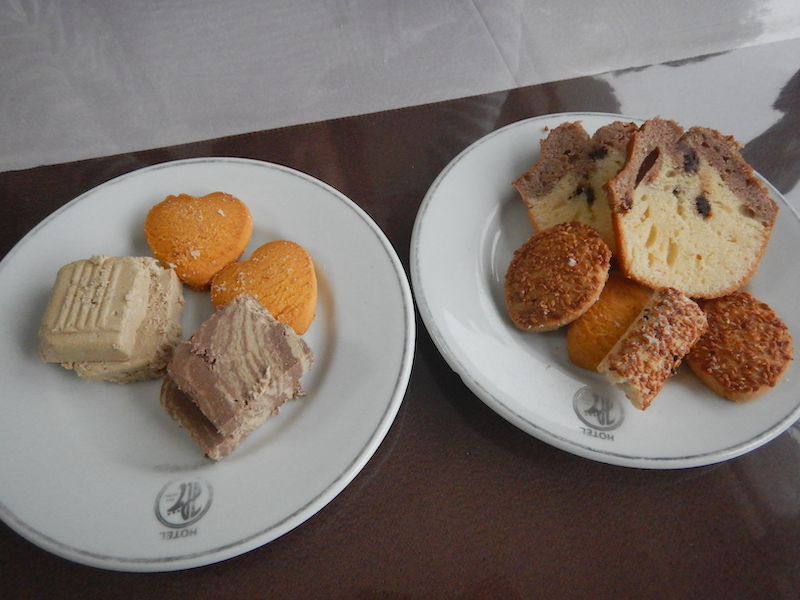 続いて定番のピンクハムとゆで卵のサラダ仕立て、よくわからないペーストとクッキー。オリーブは全部で4種類もあります。