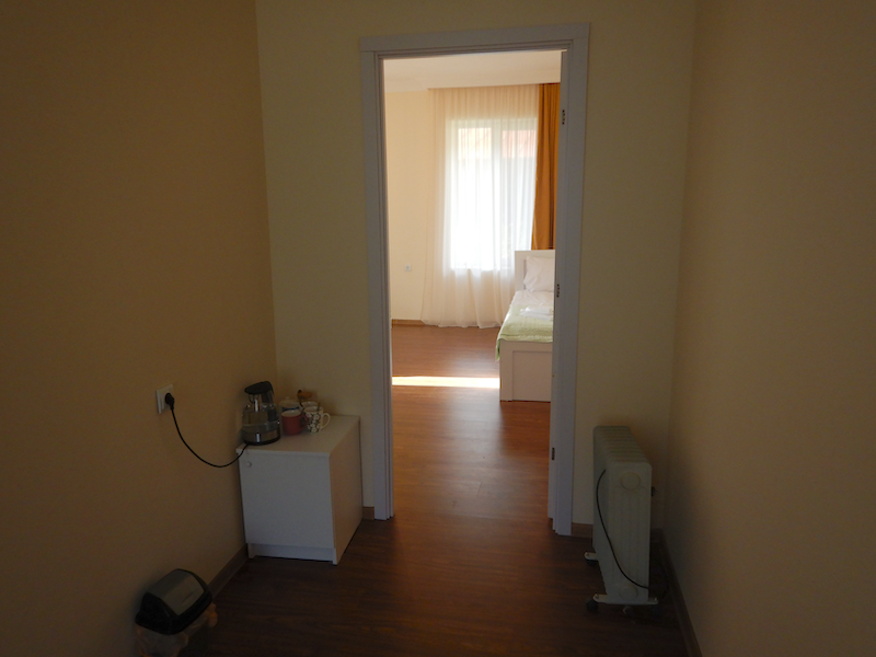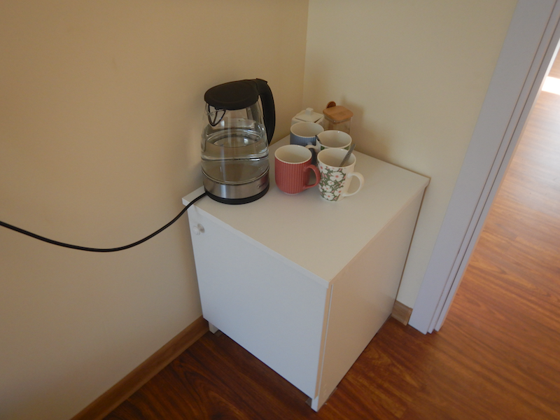 部屋の入り口に湯沸かしポットとカップ、インスタントコーヒーの瓶が置いてあります。隣にも客室があるので、そちらと共有するようです。