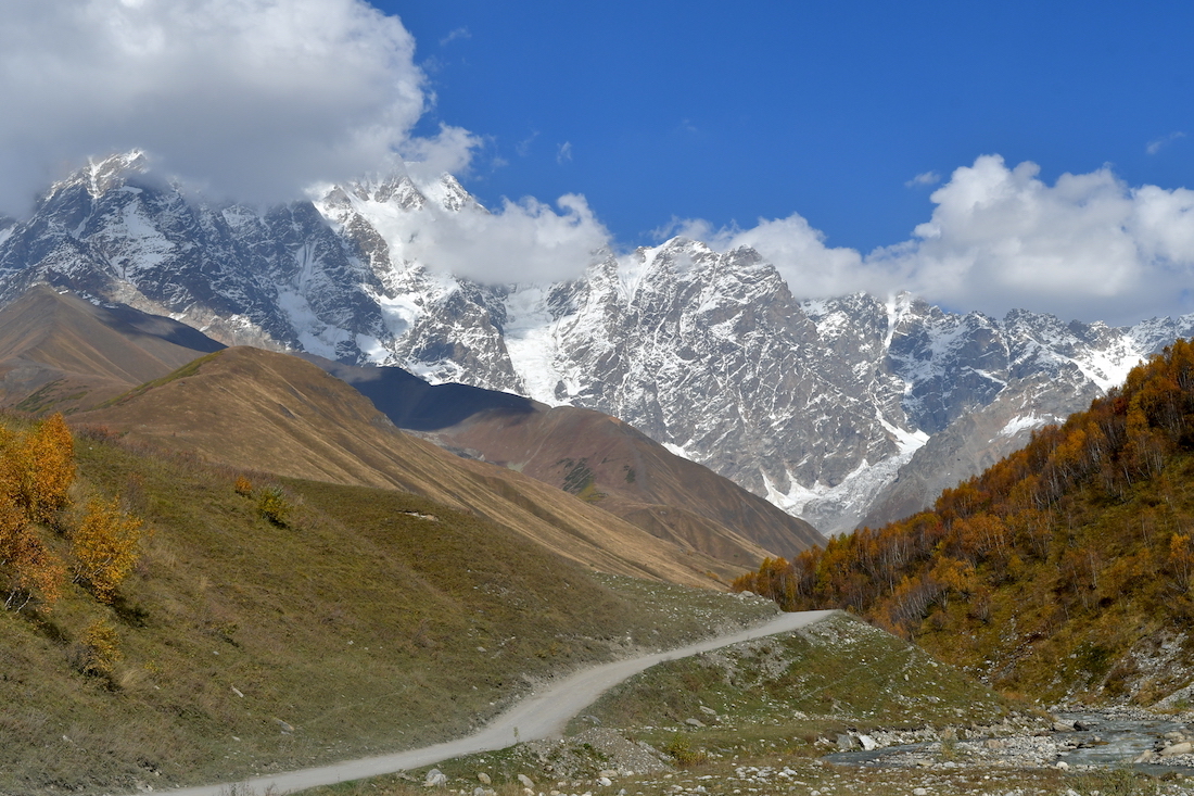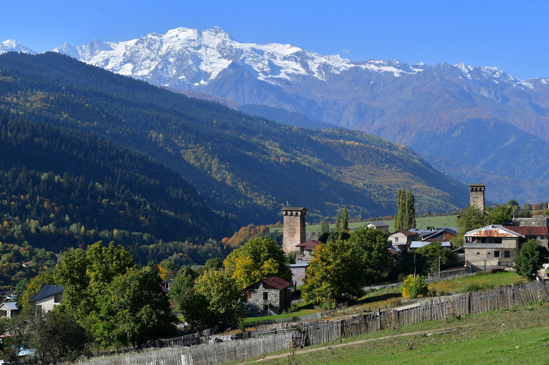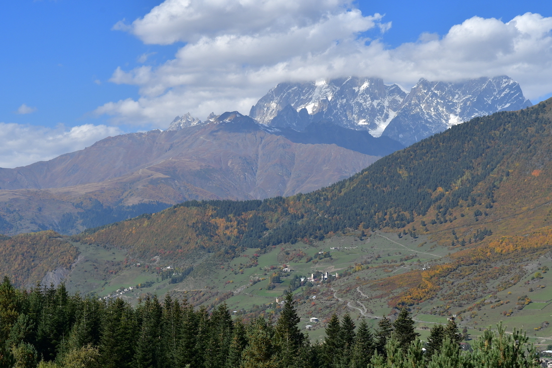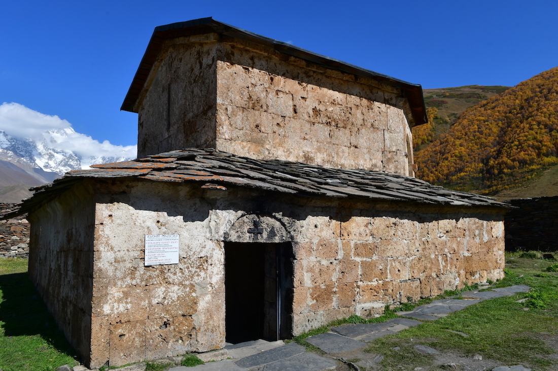 ジョージア最高峰シュハラ山5,193 mを望むウシュグリ村の教会です。