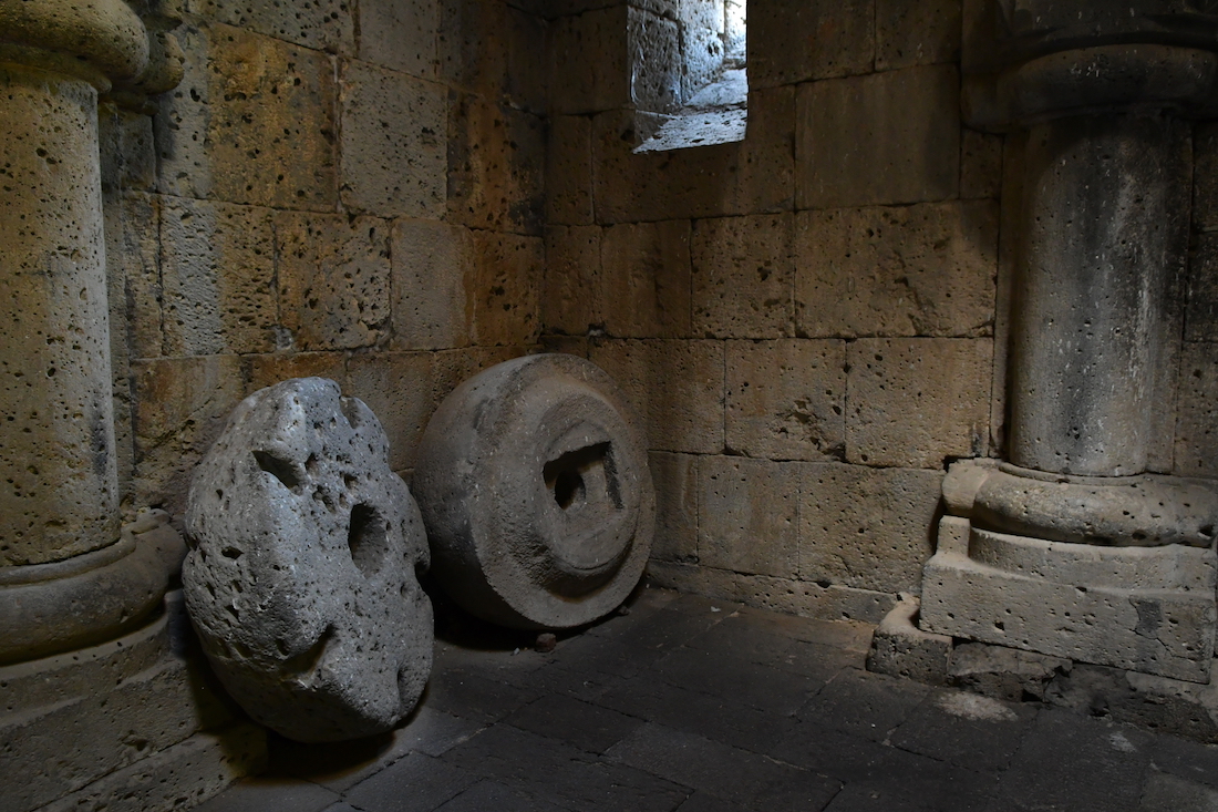 食堂の隅に置かれていた円形の石。何に使ったのだろう。石臼?