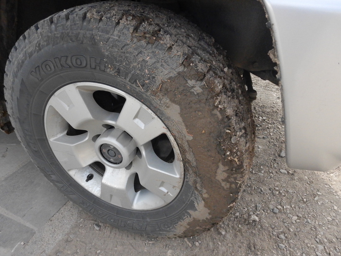宿の駐車場に駐めるとき、狭い道で切り返していたら誤って右前輪を泥の側溝へ落としました。車体がググーと右へかしいで左後輪が浮き上がりました。バックで出ようとしても左後輪が空回りするだけで動けなくなりました。典型的な亀の子スタック。