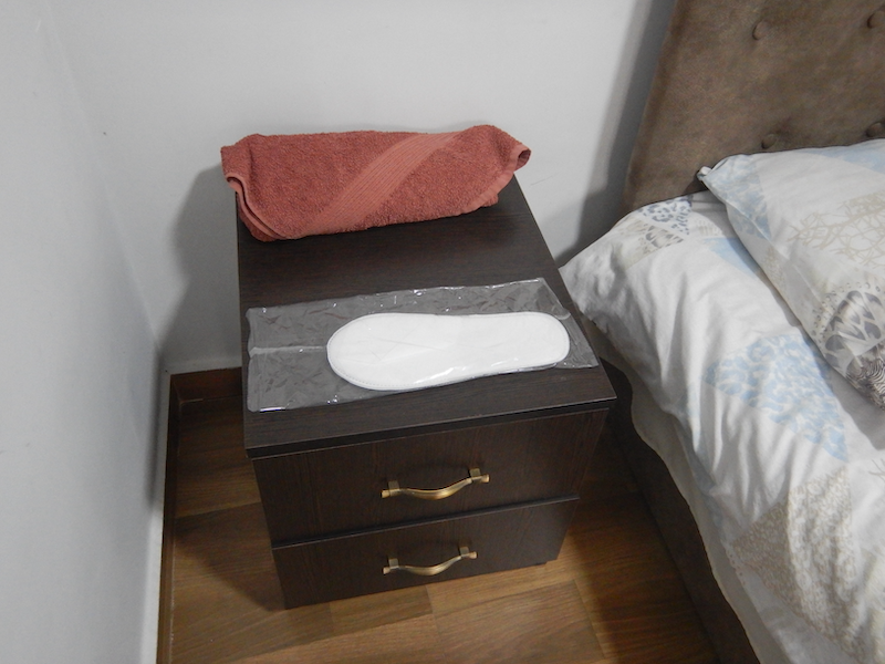 一人分のタオルとスリッパは最初からベッドサイドに置いてあり、後からもう一人分のセットを持ってきてくれました。一人泊用の部屋なのかもしれません。