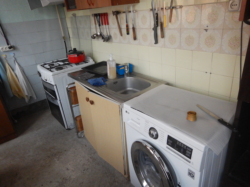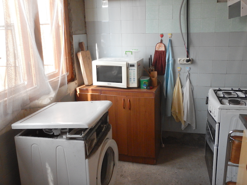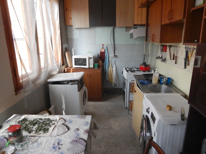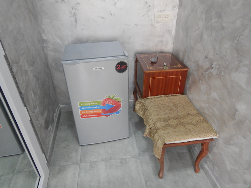 中に入ると共用キッチンです。連絡しておいた時間より早く着いてしまったので、まだ部屋の掃除が終わってないようです。ここに座ってもう少し待つように、と言われます。