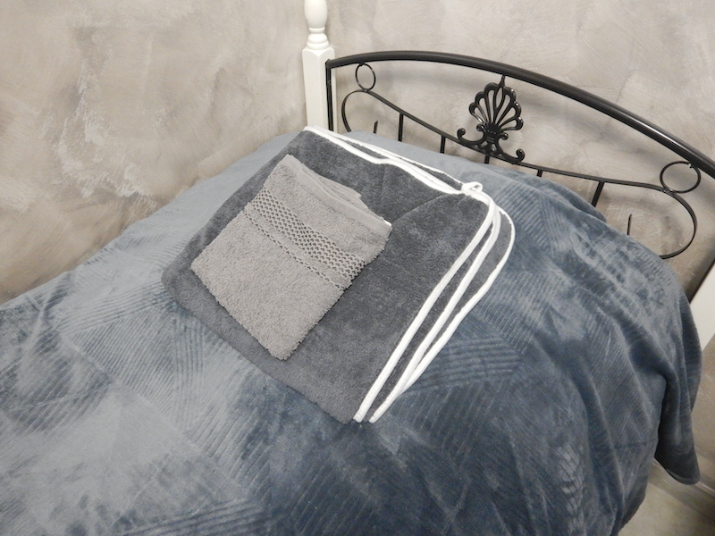 タオルが大小置いてあるのは嬉しいけれど、ベッドマットの上に直接シーツを敷いてるのでマットのコイルが背中に当たってゴリゴリするのが難点、、、。