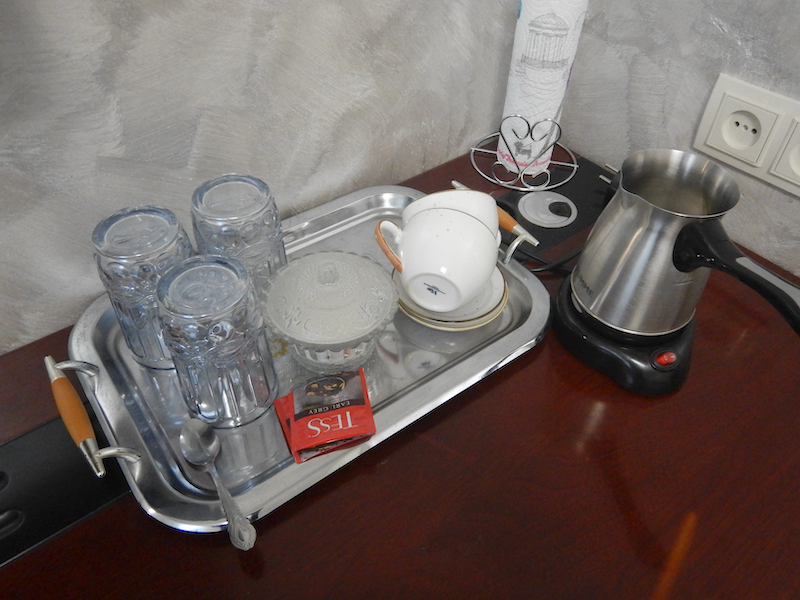 湯沸かしポットやグラス、紅茶のティーバッグが置いてあるのも嬉しいサービス♪