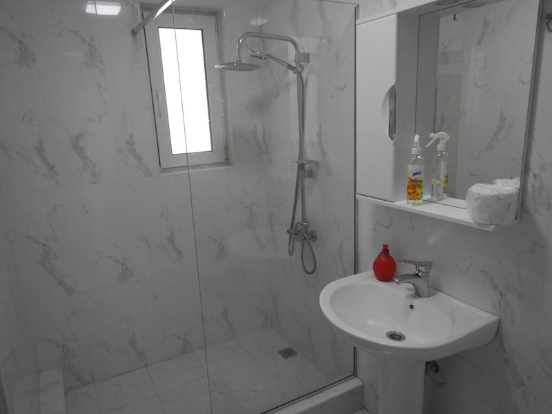 シャワーは熱いお湯が出るけれど、水圧が弱いのが残念です。