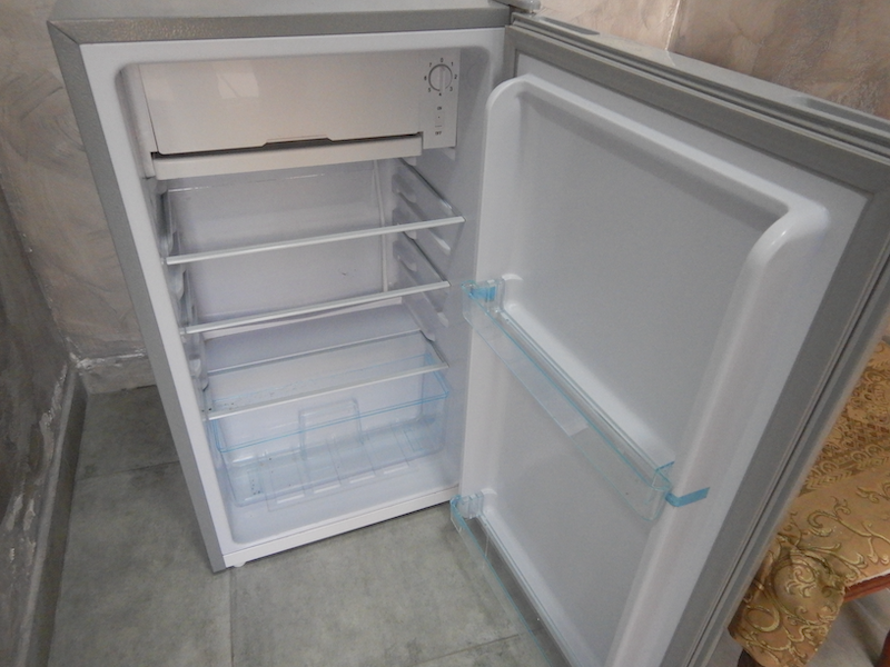 ドアを開けると正面に冷蔵庫があります。