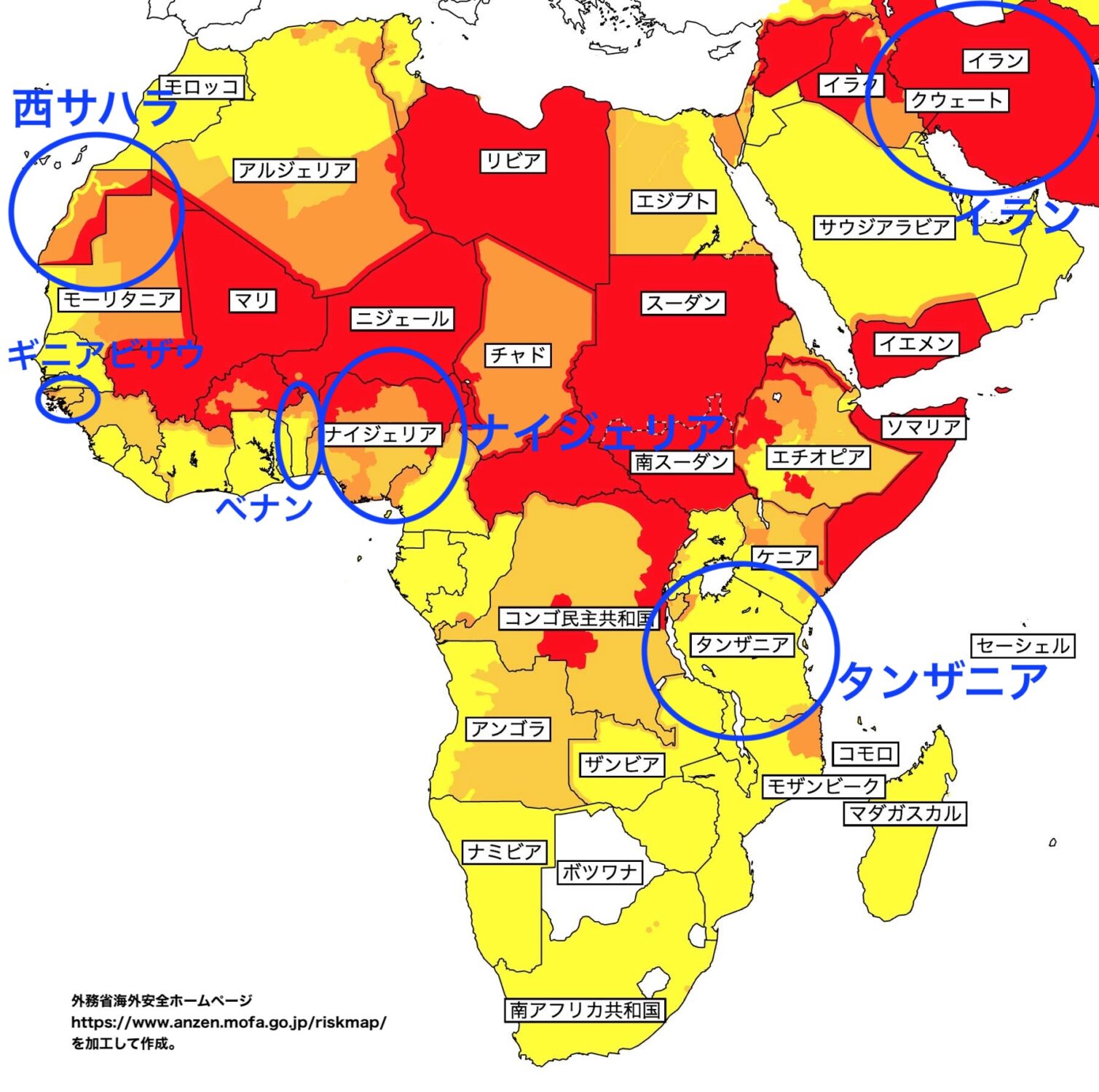 アフリカではありませんが、各種報道もされているように、イラン国内では現在、反政府運動が起こっているのに加え、中東情勢による緊迫化、核協議を巡るアメリカによる軍事攻撃の可能性など、非常に不安定な状況です。それまで全域オレンジ色だったのが、赤色になってしまいました。インターネットも遮断されているらしいです。