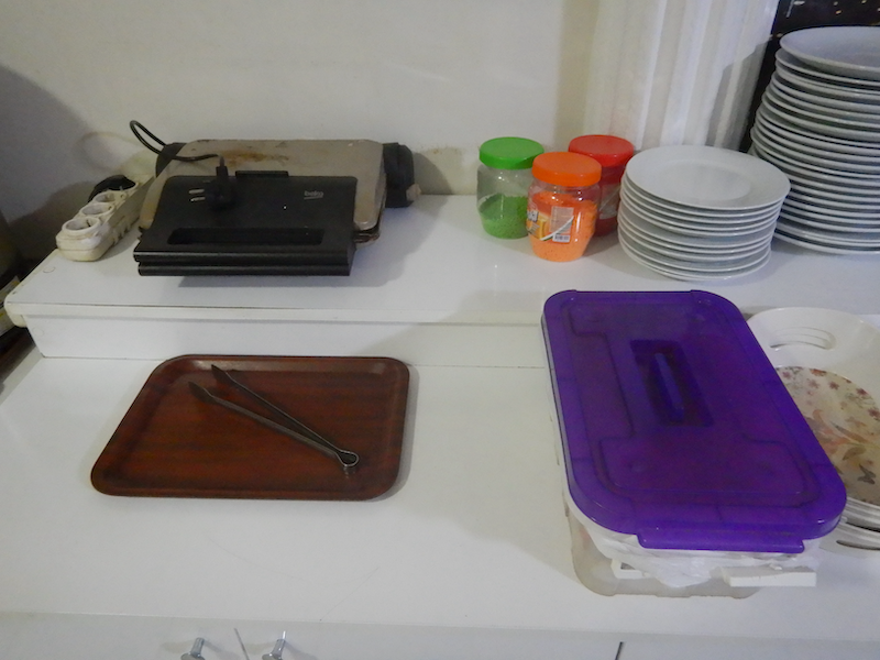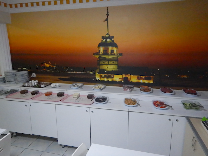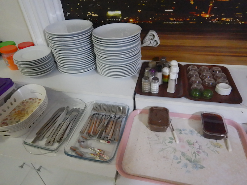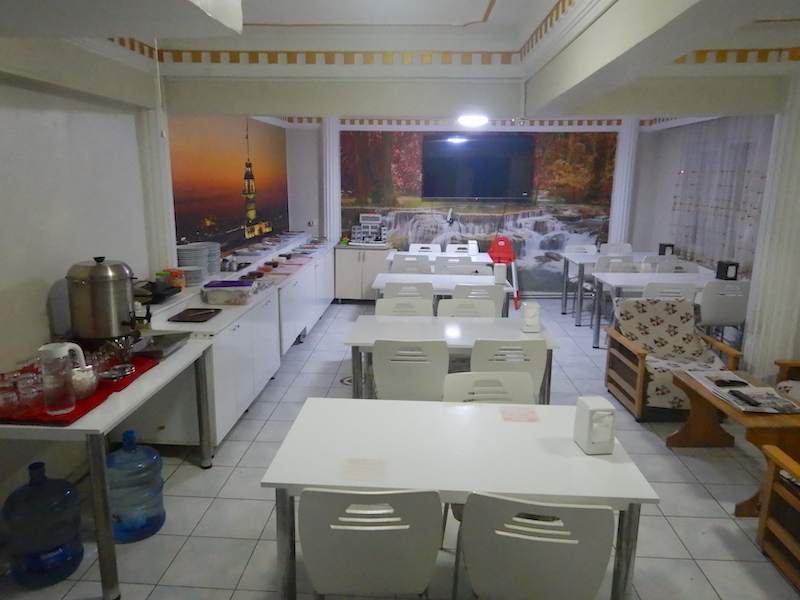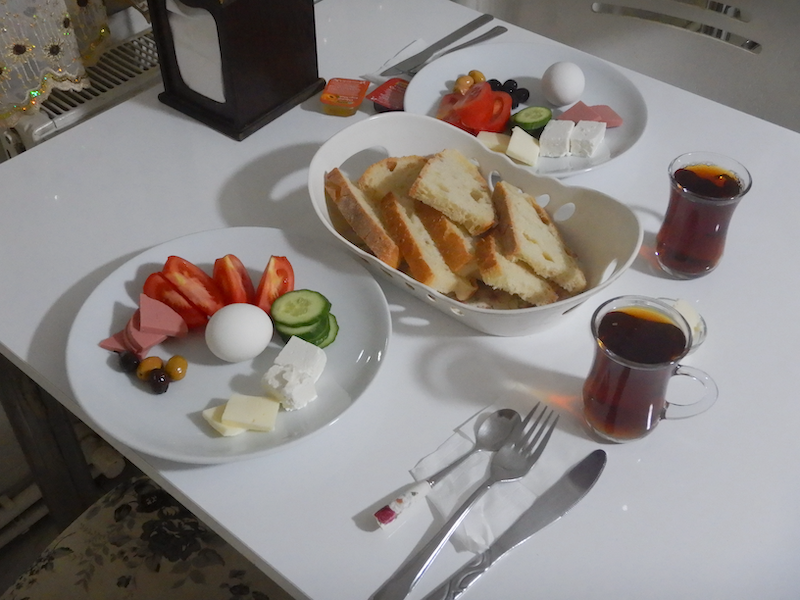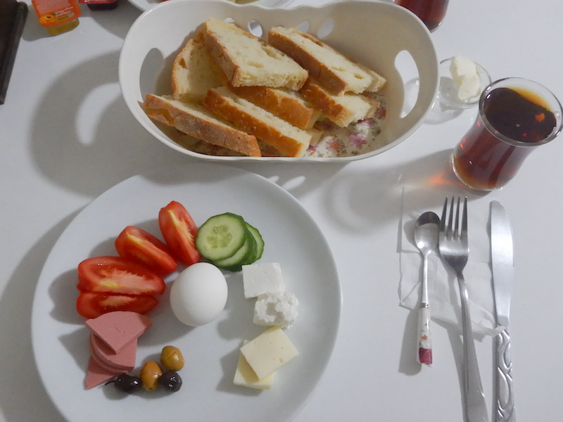 しばらくすると別のスタッフが来て、レセプション男性と交代しました。新しいスタッフはまず自分の朝食準備を始めます。その彼が、ホットサンドメーカーでパンを焼き始めたんです。それを見て『ずっと不思議に思ってた機械はトースター代わりに使うものだったのか!』と初めて気付きました。トルコに滞在して既に1ヶ月近く経ちますけどね(^人^;)