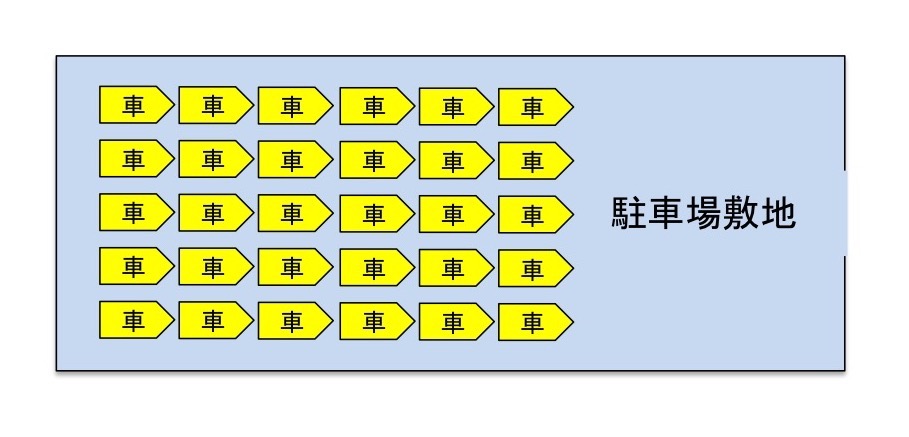 グーグルマップの航空写真でその駐車場を見て、車が↓のように駐車していたらそこはキー預けが必要な駐車場です。なぜなら奥の車の人が帰ってきたときに、手前の車を動かさなければならないから。