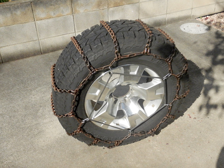 そこで試してみました。家には重すぎて積めなかった予備タイヤが一つあるのです。今になって思えば多少重くても、やはり持って行くべきだったと後悔しているのですが、それにチェーンを装着してみればいいと思いついたのです。