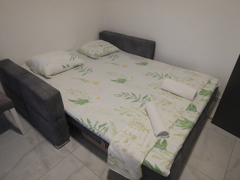 ベッドはソファベッド。12月だけど掛け布団はなく、薄い布が置いてあるだけです。