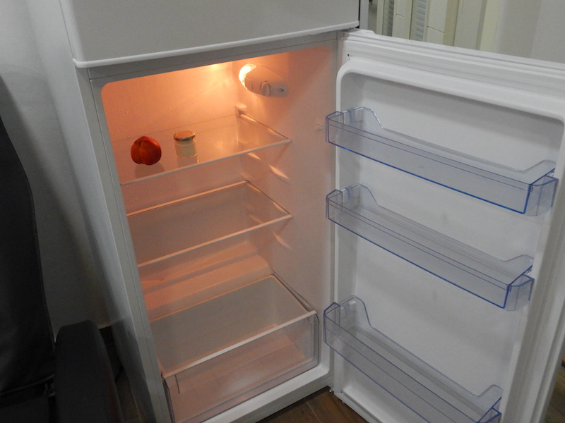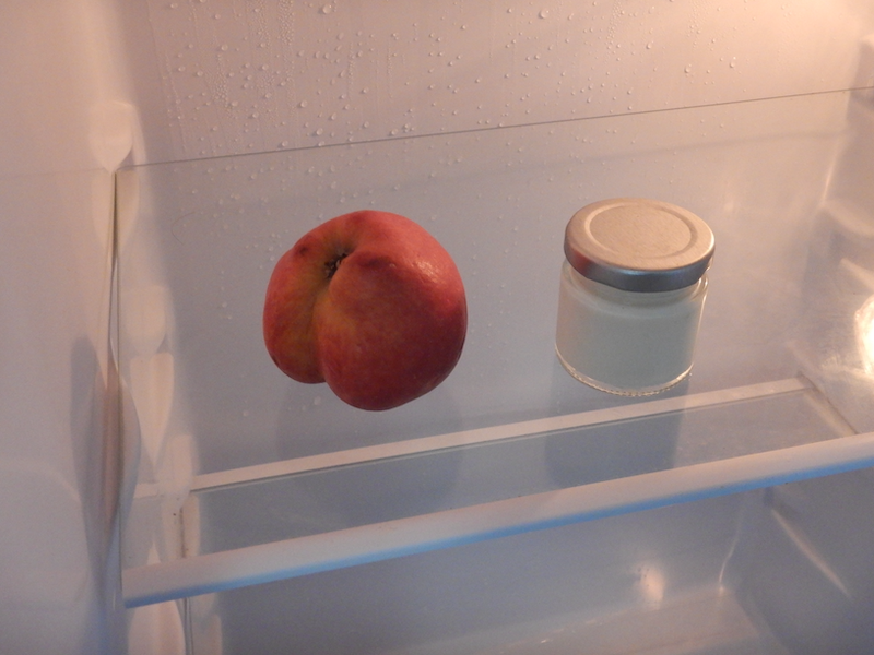 と思いながら冷蔵庫を開けたら、果物が1個と中身のわからない瓶が入ってます。