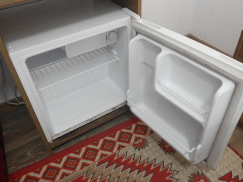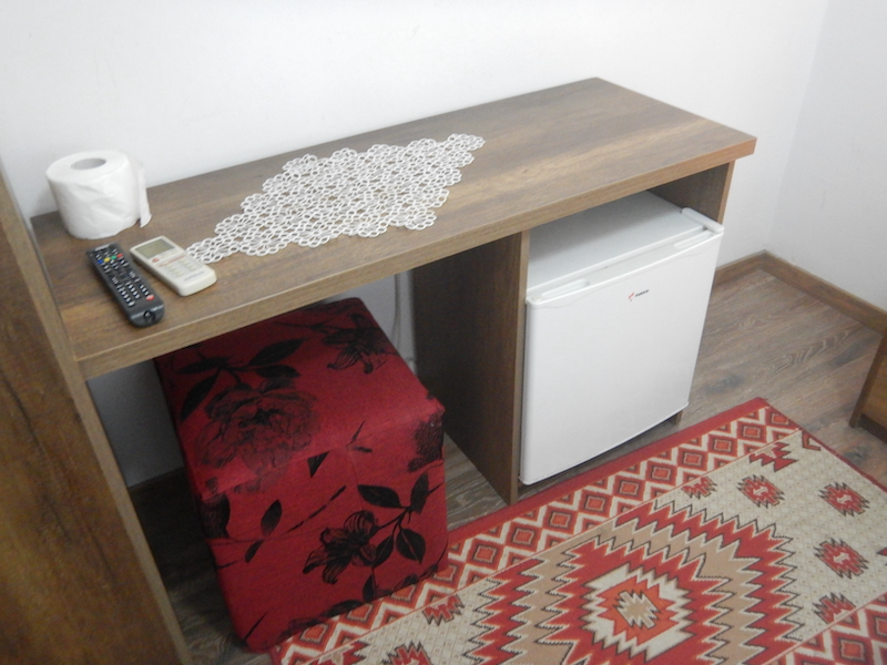 壁沿いに小さい机があり、冷蔵庫もあります。湯沸かしポットはベッドサイドテーブルの上にあります。コンセントがここにはないからだと思います。