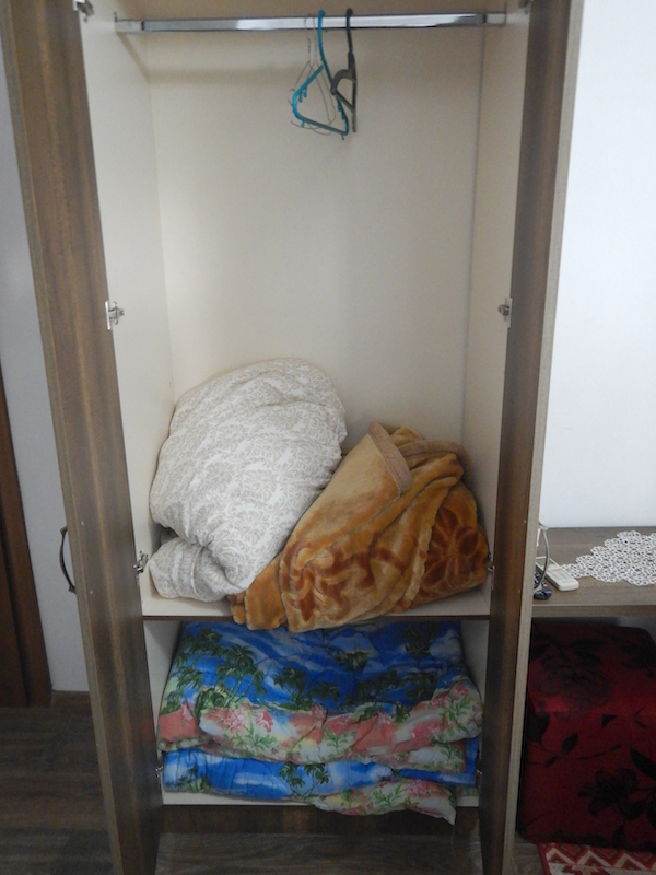 クローゼットの中に毛布と布団が入ってます。ベッドの上の布切れを広げて、その上にどちらかを掛けて寝る仕組みです。