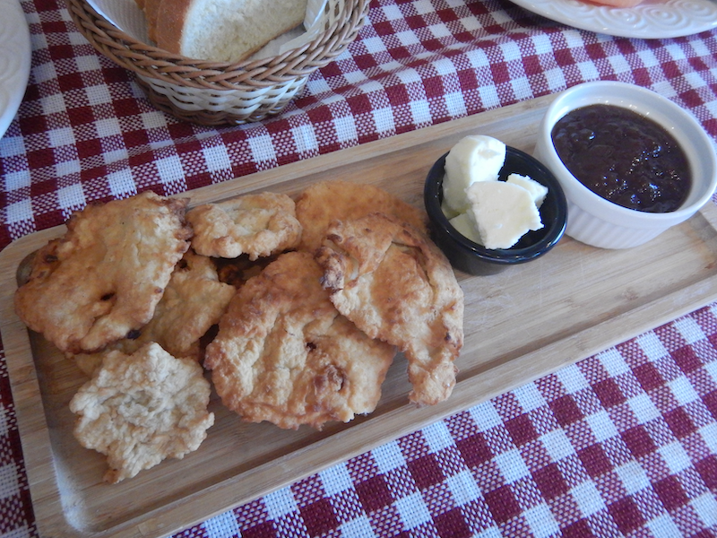 女性は「肉じゃないから大丈夫よ」と言います。作りたてのようでほんのり温かく、食べてみると揚げてないドーナツみたいです。ここにバターとジャムが付いてます。