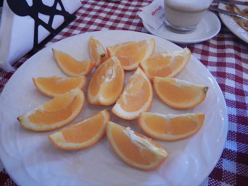 ホテルとレストランは家族経営のようで、女性は赤ちゃんをあやしながら配膳してくれます。営業中はご主人が厨房に入ってます。しばらくしたら年配の女性が来て、窓際の席で日向ぼっこを始めました。最後のオレンジは少し若い女性が持ってきてくれました。おそらく義妹じゃないかと思います。
