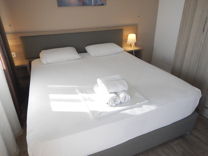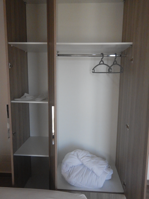 クローゼットの中に掛け布団が入ってるので、ベッド上の布を広げて、その上に布団を掛けて寝ます。アルバニアでよくあるスタイルです。
