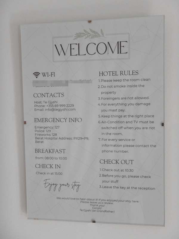 ベラトで2泊目に泊まったのは、Te Gjyshiです。手頃な値段で朝食付きなこと、そして何より事前にカード決済で支払いができるところが気に入って予約しました。