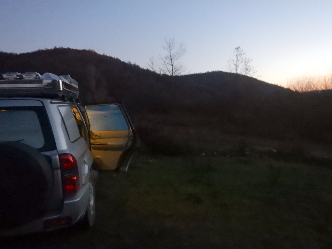 少し離れた道の路肩に駐車して、暗くなるのをジッと待ちます。