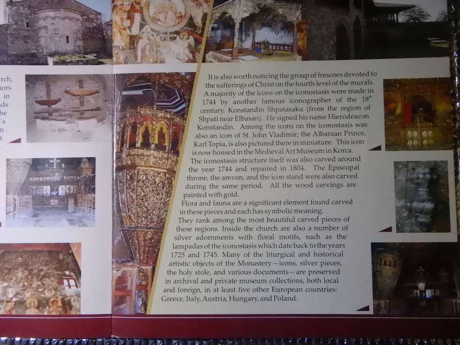 小ぶりな本堂ですが、細かな木彫りの装飾が全体に施された祭壇と十字架。壁面全体に描かれたフレスコ画には、聖書のシーンやキリストや聖人が描かれているのだと思います。