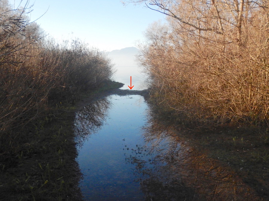 朝の湖。昨日より少し水が引いていました。矢印の部分の地面が見えてきました。