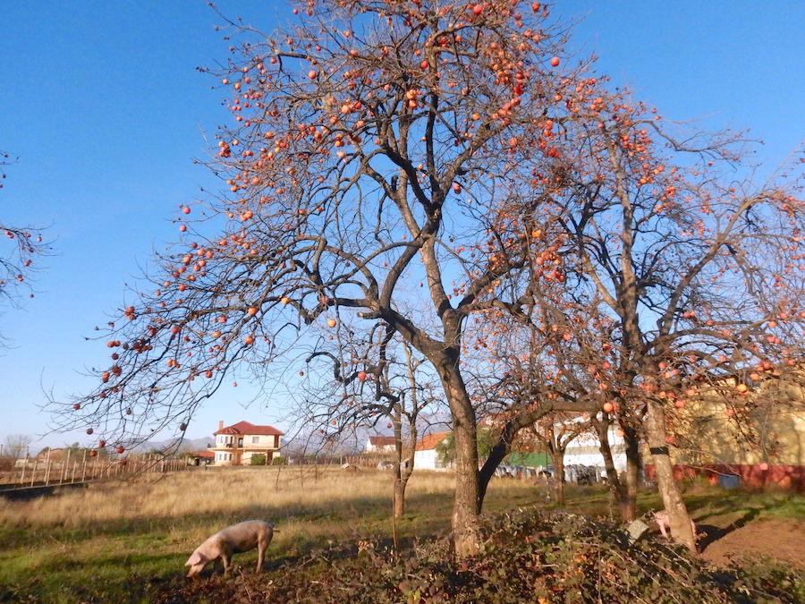 柿の木の下にブタ。たしか日本で柿食わせて育てたブタ肉が販売されていたような気がします。柿ブタの肉は美味しいと書いてあったような。