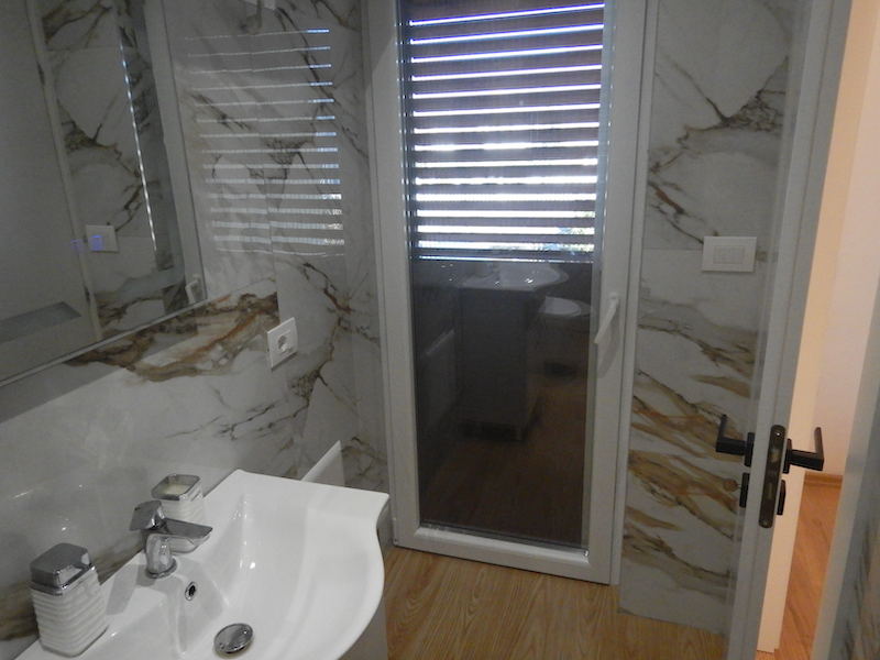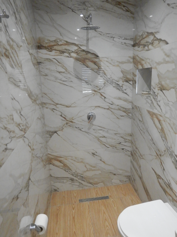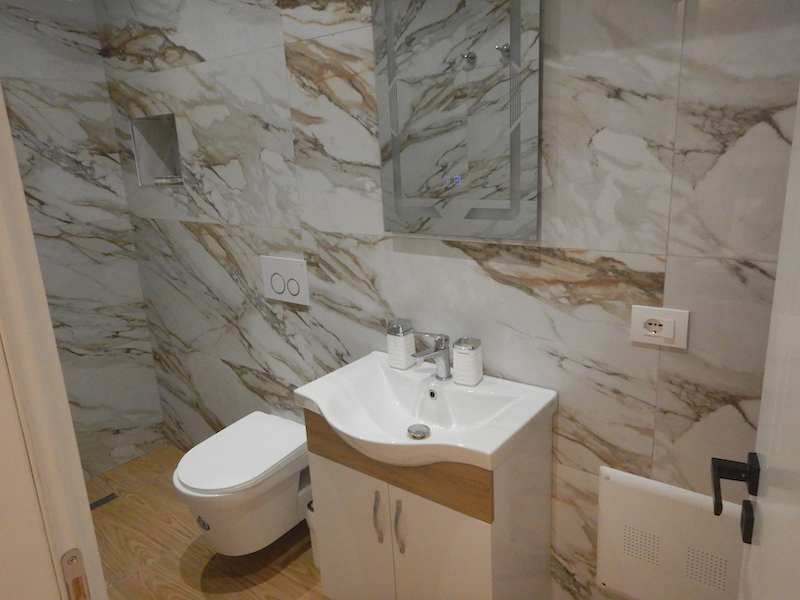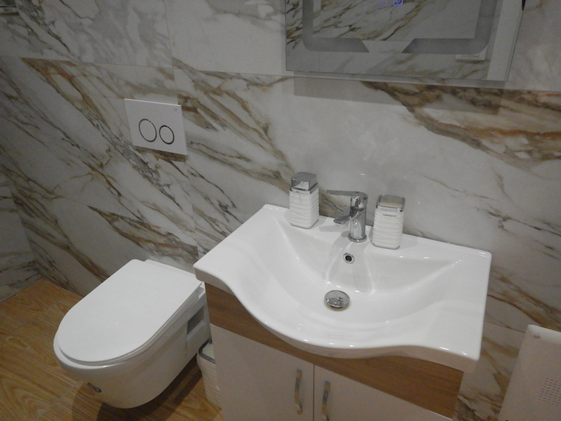 素敵なシャワーコーナーだけど、カーテンがない上にヘッドが固定式です。シャワーを浴びるとトイレまでビチャビチャになります。夜は熱いお湯が出たけど、翌朝はお湯になりませんでした。アルバニアでは初めてのことです。